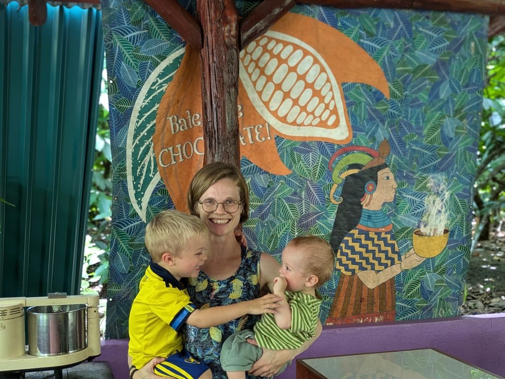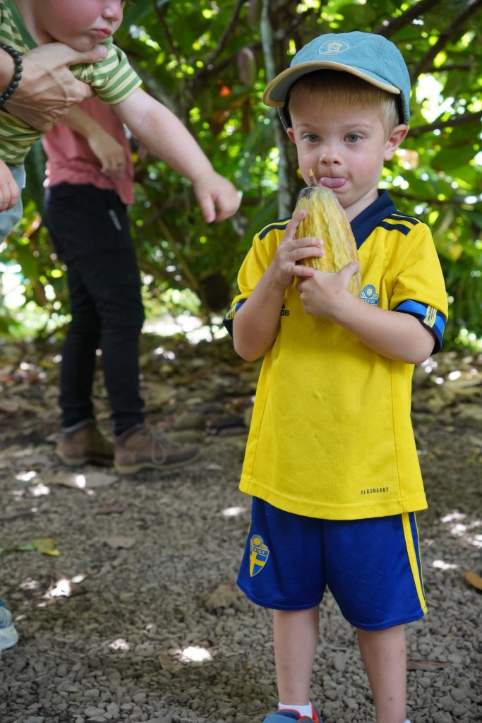 Und anschließend können die Bohnen verarbeitet werden. Hier rollt unser Guide aus den fertigen Kakaobohnen ein fettiges Muß. Theo schaut sich alles genau an und knabbert an seinem Zuckerrohr. Wir probieren den puren Kakao. Sehr bitter. Anna findet’s lecker.