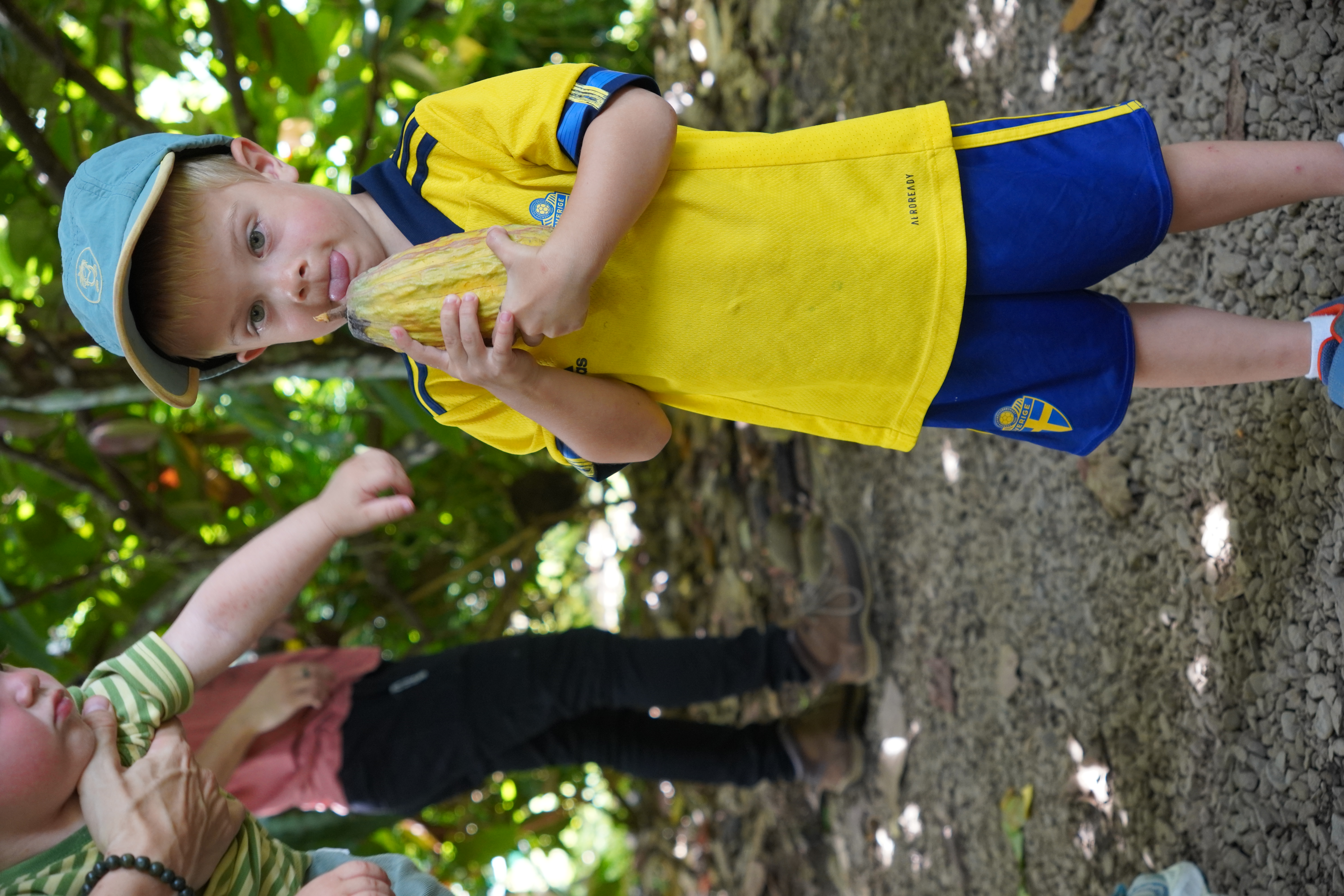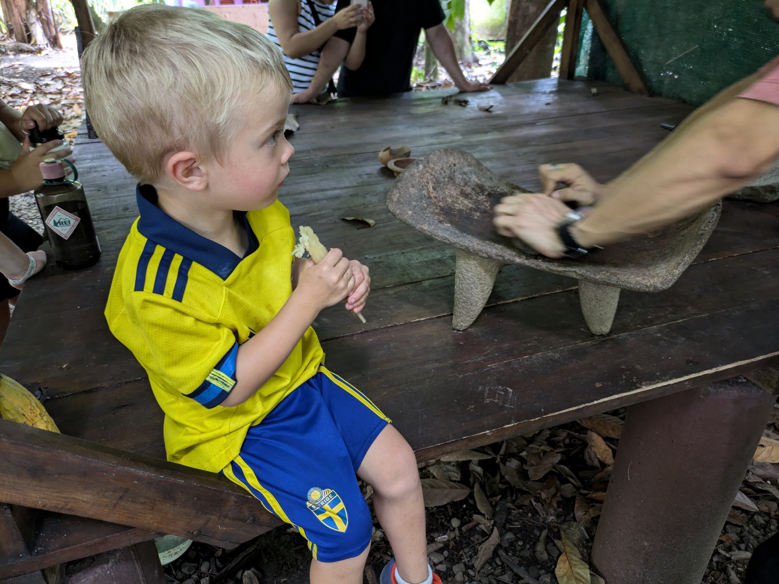 Und anschließend können die Bohnen verarbeitet werden. Hier rollt unser Guide aus den fertigen Kakaobohnen ein fettiges Muß. Theo schaut sich alles genau an und knabbert an seinem Zuckerrohr. Wir probieren den puren Kakao. Sehr bitter. Anna findet’s lecker.