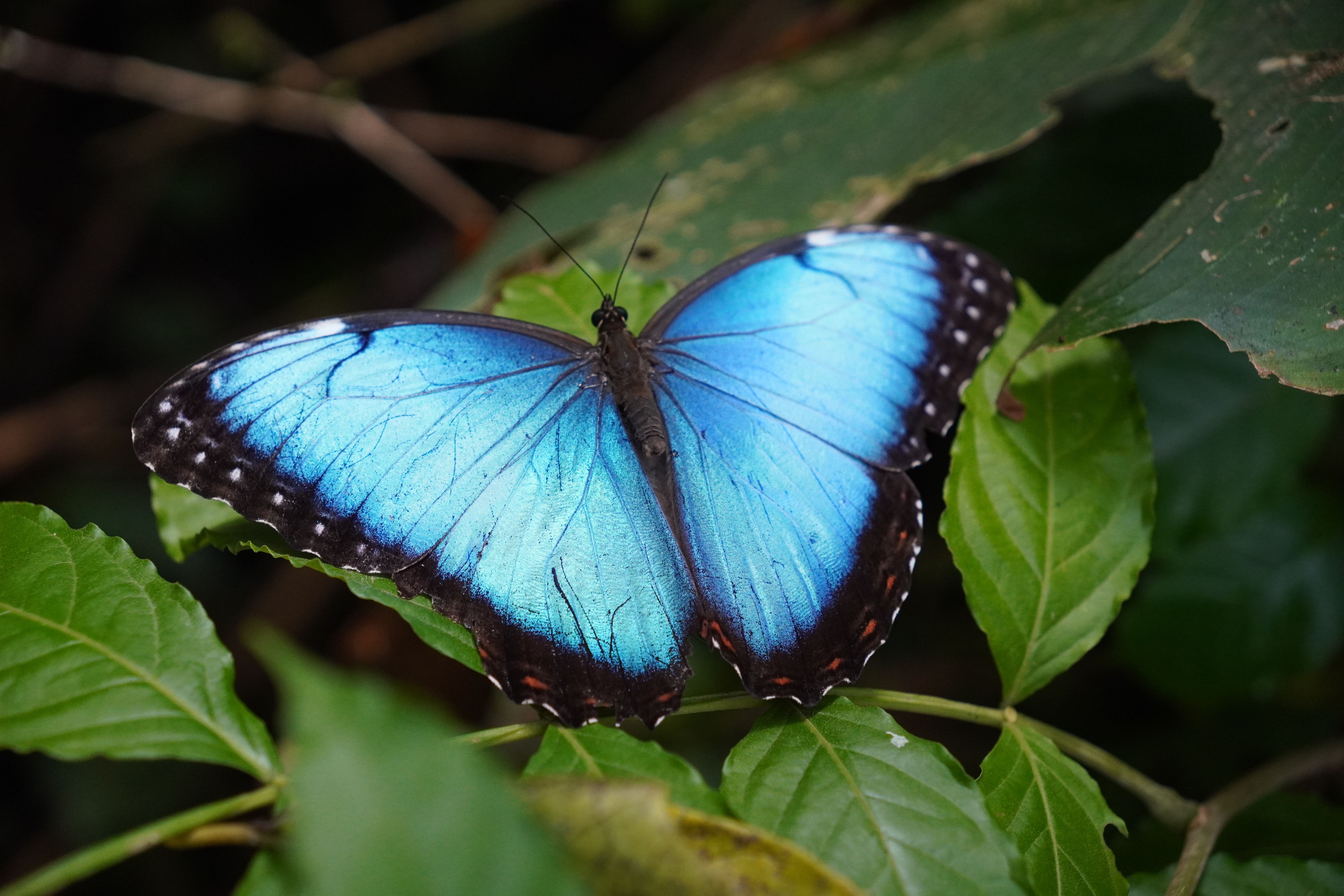 Und es legt sich ein blauer Morpho vor uns danieder. So schön haben wir ihn bisher noch nicht gesehen.